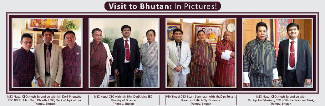 On the invitation from the concerned authorities of Bhutan, the CEO of MEX Nepal, Mr. Jitesh Surendran, embarked on a journey to the land of the thunder dragon, to furnish his valuable inputs for capital market development in the country. The visit evolved around meeting with various dignitaries from major entities including Mr. Mr. Daw Tenzin, Governor of Royal Monetary Authority of Bhutan and Dy. Governor, Mr. Dorji Phuntsho, CEO of Royal Securities Exchange of Bhutan, Mr. Dorji Dhradhul, Director of Dept of Agriculture, Mr. Kipchu Tshering, CEO of Bhutan National Bank and Mr. Nim Dorji, Joint Secretary, Ministry of Finance. There were numerous discussions held with the aforementioned dignitaries to provide the intricacies related with the development of capital market in the country. Since the stock exchange of Bhutan i.e. Royal Securities Exchange of Bhutan, is also a primary member of the South Asian Federation of Exchanges, Pakistan, the mutual participation & co-operation between the duo is bound to herald endless possibilities in the ensuing future. MEX Nepal is honored and privileged to provide consultancy for the development of the Capital market in Bhutan and hopes that the visit is the beginning of an enduring relationship in the days ahead!