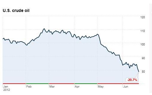 Oil prices have finally dipped below the $80 mark on Thursday. Analysts claim that because psychological barrier, which had provided resistance at the $80 dollar mark has been crossed, there is nothing stopping oil from declining further based on market fundamentals. Compared to the start of 2012 Oil has declined by 20%.