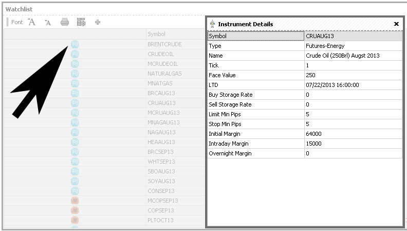 Traders can view the instrument details by simply clicking on the instrument icon, provided on the first column of the Watchlist dialog box.