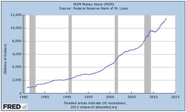 The above illustration shows the money inventory continues to rise despite its negative effect on the economy. In the past four years the Obama administration, in collaboration with the U.S. Congress, has added five trillion dollars to the U.S. Federal debt. At the same time five Central Banks printed seven trillion dollars in new currency. Thus twelve trillion dollars that did not exist in 2008 are now looking for a residence. This monetary destruction produces price inflation (after a gap as it takes the average person a while to catch on). “Like gold, US dollars have value only to the extent that they are strictly limited in supply. But the US government has a technology called the printing press that allows us to print as many dollars as the government wishes, at essentially no cost” the words of the man himself, Ben Bernanke.