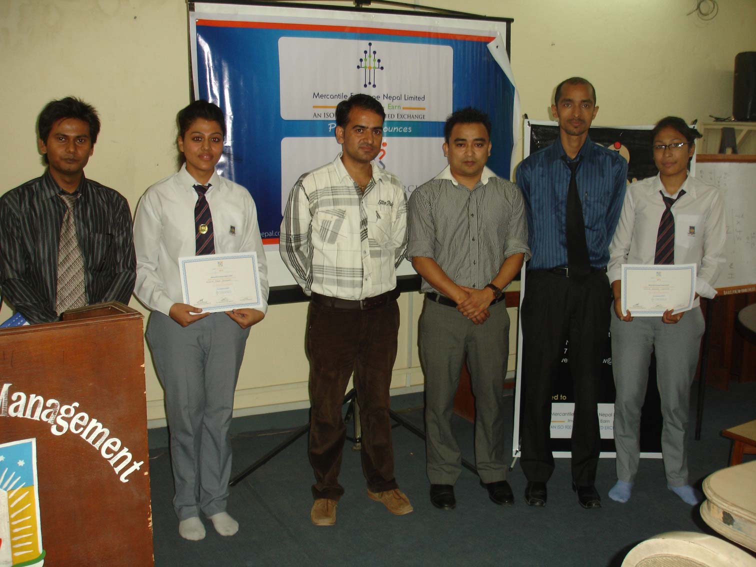 MEX Talent Search 2012- an initiative of MEX-was organized at DAV College, amidst much hype and buzz from the participating students. The competition began with the introduction to the competition and the rules thereafter by the moderator. One by one, students were asked to shed light on the topic entitled, “Impact of unstable government in the financial market of Nepal” The students cited numerous examples related to the topic and exuberantly expressed their opinions. The esteemed panel of judges evaluating the students on their public speaking ability included the Manager of R&D Dept. at MEX Nepal, Mr. Amit Pyakurel, the faculty of management member of the college itself, Mr. Roshan Aryal and representing Yellow Investment Private Limited, a broker affiliated with MEX, Mr. Chandan Karki. The judges evaluated the students on various aspects including the content furnished, delivery and persuasion amongst others. At the conclusion of the event, Miss. Dibya Dhungana emerged victorious edging out Miss. Bhumika Shrestha to the runners-up position. The winners received certificates from Mr. Roshan Aryal, the faculty management member of the college itself.