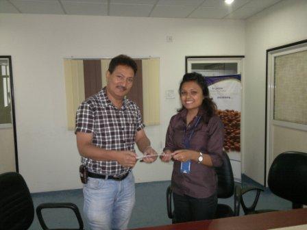 (The representative of ABHIYAN, Mr. Krishna Malla, receiving the cheque from the Deputy General Manager of MEX Nepal, Miss. Sonu Jain.) |
