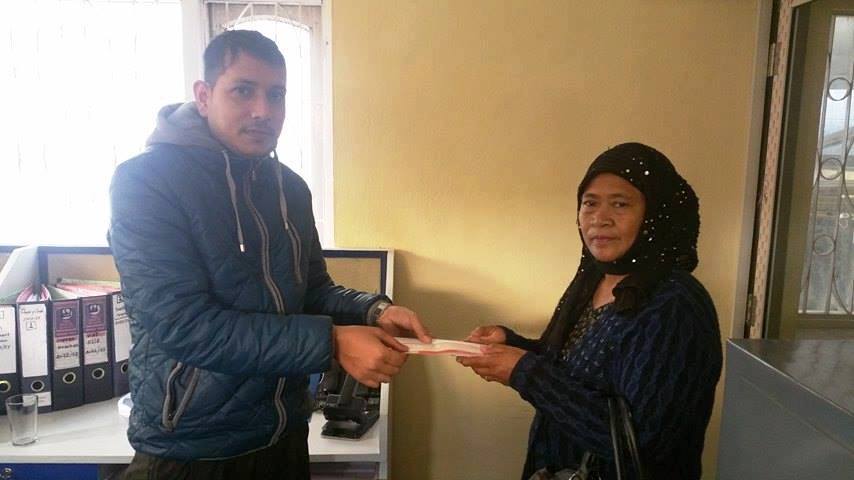 (Mrs. Meena Lama, representative of Rasuwa Langtang Liring Orphan Society, accepting the contribution from ERM of MEX Nepal, Mr. Narendra Pd. Bhatt.)