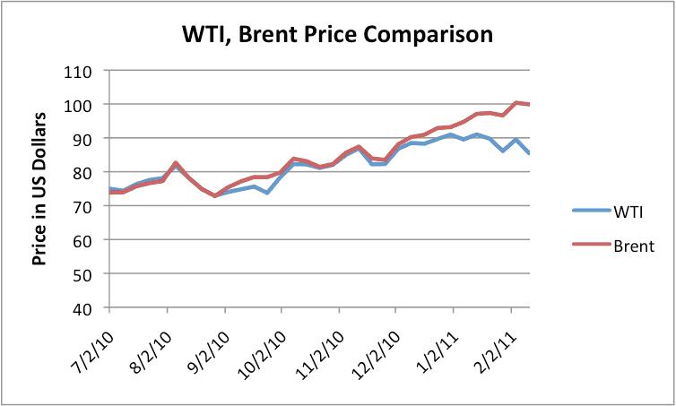 There existed a typical price difference per barrel of between +/- 3 USD/barrel prior to September 2010 in the prices of WTI and Brent Crude. However since the autumn of 2010 there has been a divergence in the prices reaching over $11 a barrel by the end of February 2011. Many reasons have been attributed for this widening divergence ranging from a speculative change away from WTI trading, dollar currency movement, regional demand variations, and even politics. In February 2011, the divergence reached $16 during a supply shortage at the North Sea and simultaneous record stockpile at Cushing, Oklahoma. Historically, the different price spreads are based on physical variations in supply and demand (short term).