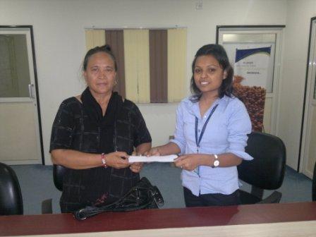 (The Deputy General Manager of MEX Nepal, Miss. Sonu Jain, handing over the cheque to the authorized person of Rasuwa Langtang Liring Orphan Society.) |