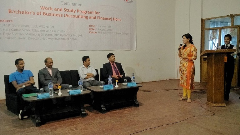 Mid-Valley International College organized a Seminar on “Work and Study Program for Bachelors of Business (Accounting and Finance) Hons” on 29 August 2016. CEO, Mr. Jitesh Surendran along with the General Manager, Mrs. Sonu Jain and Senior Manager, Mr. Amit Pyakurel represented MEX Nepal on this momentous occasion. Speakers from other organizations included Mr. Rajiv Sharma, Managing Director of Jobs Dynamics, Mr. Prakash Tiwari, Director of Hathway Investment and Mr. Hari Silwal, Educator & Counselor. All the speakers encouraged the students to simultaneously work to gain practical exposure in a workplace to complement the theoretical knowledge. Starting early is the key to creating better job opportunities for the future. The college offers Bachelor of Business (Finance) and Bachelor of Business (Accounting) Hons. It is a four-year program affiliated with HELP University, Malaysia.