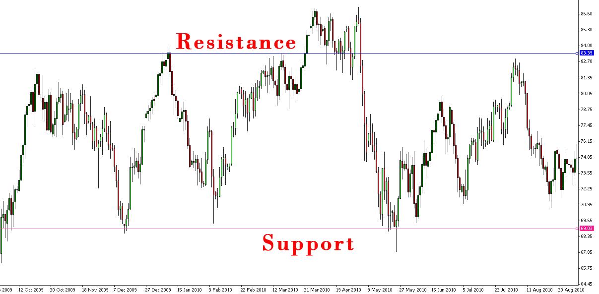 Support: A support is a pre-determined price level at which demand is strong enough to prevent the prices from declining further. The support level normally lies below the current price. When the prices move towards the support level buyers normally become more inclined to buy and sellers become less inclined to sell. When prices reach the support level, demand will overcome supply, thereby reversing the trend. An investor will take a long position in this situation as the prices will rise towards the pivot point. But if the prices breach the support level, then the investor is likely to take a short position, as the prices will normally move towards the second support level.