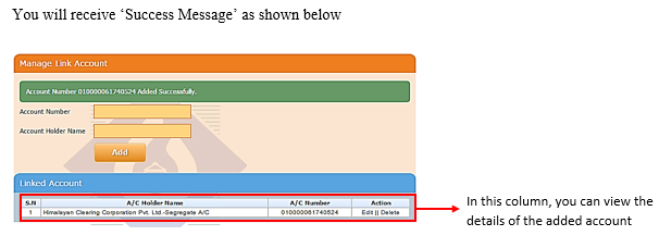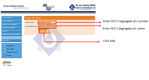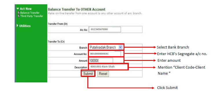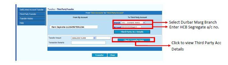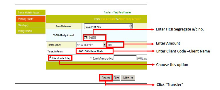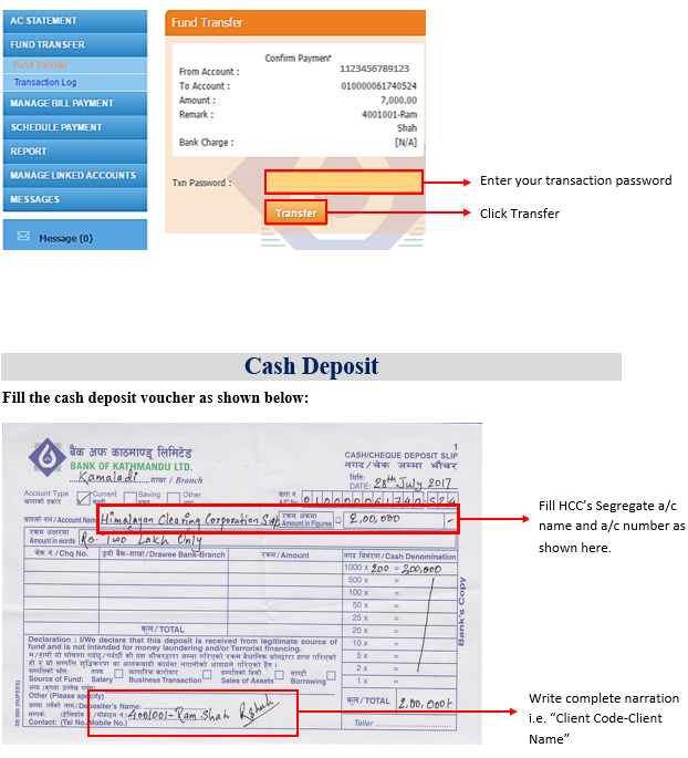 त्यसपछि, सहि विवरण “ग्राहक कोड — ग्राहकको पुरा नाम” उल्लेख गरि ग्राहकले कारोबारका लागि क्लियरिङ्ग हाउसको सेग्रिगेट खातामा रकम जम्मा गर्नुपर्छ (यसको थप प्रक्रियाका लागि ग्राहकको हाते किताब हेर्नुहोला) ।