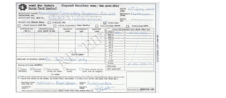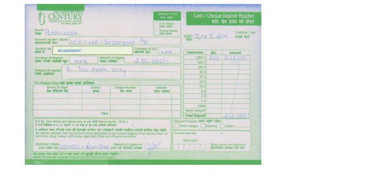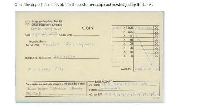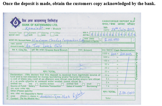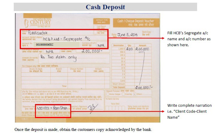 कारोबारका लागि रकम जम्मा गर्न ग्राहकले सँधै “Customer Name” मा ग्राहकको पूरा नाम र “Client Code” मा सहि ग्राहक कोड भर्नुपर्छ ।