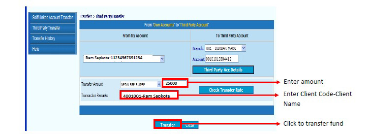 त्यसपछि, “Customer Name” मा ग्राहकको पूरा नाम र “Client Code” मा सहि ग्राहक कोड उल्लेख गरि ग्राहकले कारोबारका लागि ई–सेवाको माध्यमबाट क्लियरिङ्ग हाउसको सेग्रिगेट खातामा रकम जम्मा गर्नुपर्छ ।